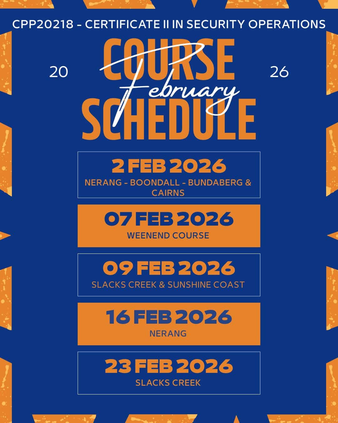 Our Certificate II in Security Operations courses are delivered regularly across Brisbane, the Gold Coast, Logan, Sunshine Coast, Gympie and Bundaberg, giving you flexibility to choose a location and date that suits your schedule.